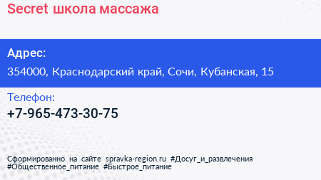 Secret, школа массажа по адресу 354000, Краснодарский край, Сочи, Кубанская, 15 в дальнейшем Организация, размещена в следующих категориях: