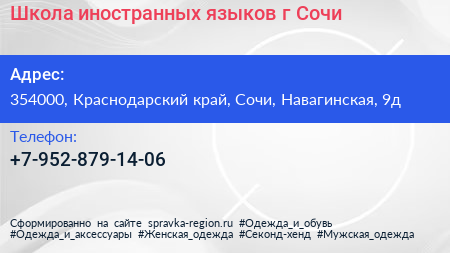 Школа иностранных языков, г. Сочи по адресу 354000, Краснодарский край, Сочи, Навагинская, 9д в дальнейшем Организация, размещена в следующих категориях: