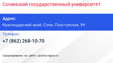 Сочинский государственный университет по адресу Краснодарский край, Сочи, Пластунская, 94 в дальнейшем Организация, размещена в следующих категориях: