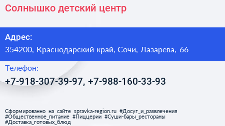 Солнышко, детский центр по адресу 354200, Краснодарский край, Сочи, Лазарева, 66 в дальнейшем Организация, размещена в следующих категориях: