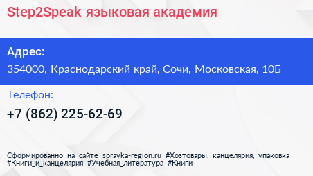 Step2Speak, языковая академия по адресу 354000, Краснодарский край, Сочи, Московская, 10Б в дальнейшем Организация, размещена в следующих категориях:
