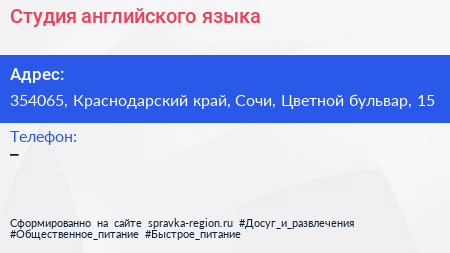 Студия английского языка по адресу 354065, Краснодарский край, Сочи, Цветной бульвар, 15 в дальнейшем Организация, размещена в следующих категориях: