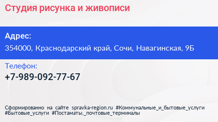 Студия рисунка и живописи по адресу 354000, Краснодарский край, Сочи, Навагинская, 9Б в дальнейшем Организация, размещена в следующих категориях: