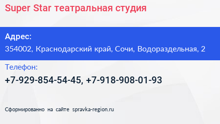 Super Star, театральная студия по адресу 354002, Краснодарский край, Сочи, Водораздельная, 2 в дальнейшем Организация, размещена в следующих категориях: