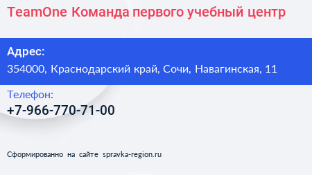 TeamOne. Команда первого, учебный центр по адресу 354000, Краснодарский край, Сочи, Навагинская, 11 в дальнейшем Организация, размещена в следующих категориях: