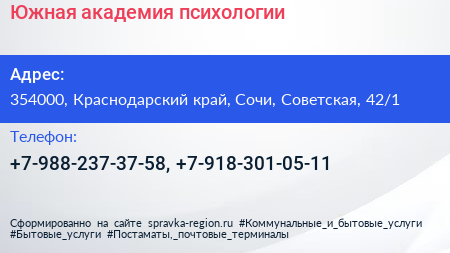 Южная академия психологии по адресу 354000, Краснодарский край, Сочи, Советская, 42/1 в дальнейшем Организация, размещена в следующих категориях: