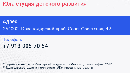 Юла, студия детского развития по адресу 354000, Краснодарский край, Сочи, Советская, 42 в дальнейшем Организация, размещена в следующих категориях: