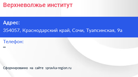 Верхневолжье, институт по адресу 354057, Краснодарский край, Сочи, Туапсинская, 9а в дальнейшем Организация, размещена в следующих категориях: