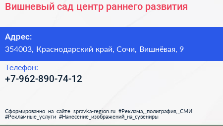 Вишневый сад, центр раннего развития по адресу 354003, Краснодарский край, Сочи, Вишнёвая, 9 в дальнейшем Организация, размещена в следующих категориях: