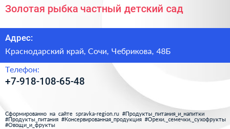 Золотая рыбка, частный детский сад по адресу Краснодарский край, Сочи, Чебрикова, 48Б в дальнейшем Организация, размещена в следующих категориях: