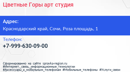 Цветные Горы, арт-студия по адресу Краснодарский край, Сочи, Роза площадь, 1 в дальнейшем Организация, размещена в следующих категориях: