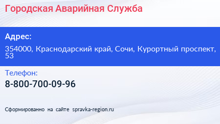 Городская Аварийная Служба по адресу 354000, Краснодарский край, Сочи, Курортный проспект, 53 в дальнейшем Организация, размещена в следующих категориях: