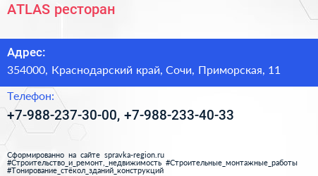 ATLAS, ресторан по адресу 354000, Краснодарский край, Сочи, Приморская, 11 в дальнейшем Организация, размещена в следующих категориях: