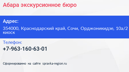 Абара, экскурсионное бюро по адресу 354000, Краснодарский край, Сочи, Орджоникидзе, 10а/2 киоск в дальнейшем Организация, размещена в следующих категориях: