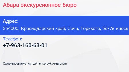 Абара, экскурсионное бюро по адресу 354000, Краснодарский край, Сочи, Горького, 56/7в киоск в дальнейшем Организация, размещена в следующих категориях: