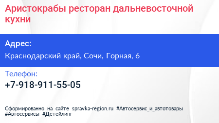 Аристокрабы, ресторан дальневосточной кухни по адресу Краснодарский край, Сочи, Горная, 6 в дальнейшем Организация, размещена в следующих категориях: