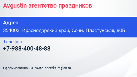 Avgustin, агентство праздников по адресу 354003, Краснодарский край, Сочи, Пластунская, 80Б в дальнейшем Организация, размещена в следующих категориях: