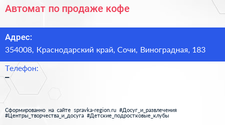 Автомат по продаже кофе по адресу 354008, Краснодарский край, Сочи, Виноградная, 183 в дальнейшем Организация, размещена в следующих категориях: