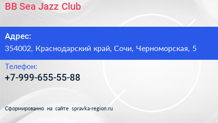 BB Sea Jazz Club по адресу 354002, Краснодарский край, Сочи, Черноморская, 5 в дальнейшем Организация, размещена в следующих категориях: