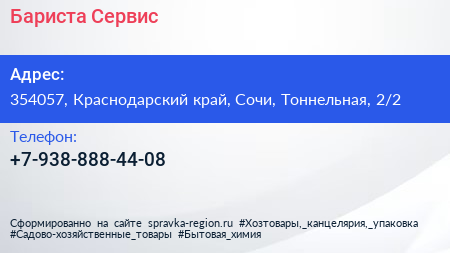 Бариста Сервис по адресу 354057, Краснодарский край, Сочи, Тоннельная, 2/2 в дальнейшем Организация, размещена в следующих категориях:
