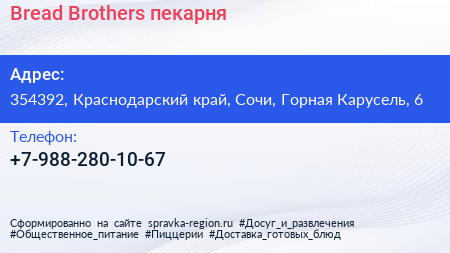 Bread Brothers, пекарня по адресу 354392, Краснодарский край, Сочи, Горная Карусель, 6 в дальнейшем Организация, размещена в следующих категориях: