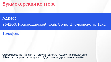 Букмекерская контора по адресу 354200, Краснодарский край, Сочи, Циолковского, 12/2 в дальнейшем Организация, размещена в следующих категориях: