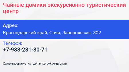 Чайные домики, экскурсионно-туристический центр по адресу Краснодарский край, Сочи, Запорожская, 302 в дальнейшем Организация, размещена в следующих категориях: