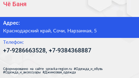 Чё? Баня! по адресу Краснодарский край, Сочи, Нарзанная, 5 в дальнейшем Организация, размещена в следующих категориях: