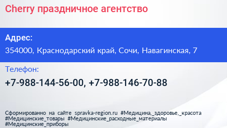 Cherry, праздничное агентство по адресу 354000, Краснодарский край, Сочи, Навагинская, 7 в дальнейшем Организация, размещена в следующих категориях: