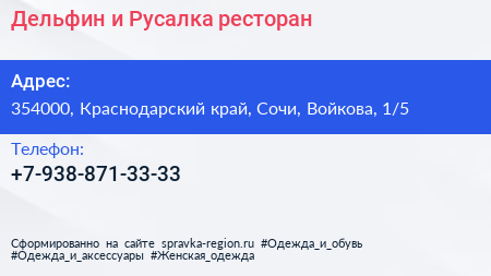 Дельфин и Русалка, ресторан по адресу 354000, Краснодарский край, Сочи, Войкова, 1/5 в дальнейшем Организация, размещена в следующих категориях:
