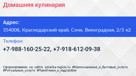 Домашняя кулинария по адресу 354008, Краснодарский край, Сочи, Виноградная, 2/3 к2 в дальнейшем Организация, размещена в следующих категориях: