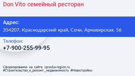 Don Vito, семейный ресторан по адресу 354207, Краснодарский край, Сочи, Армавирская, 56 в дальнейшем Организация, размещена в следующих категориях: