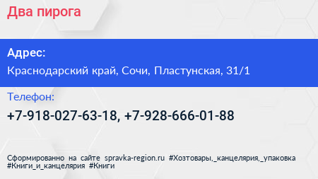 Два пирога по адресу Краснодарский край, Сочи, Пластунская, 31/1 в дальнейшем Организация, размещена в следующих категориях: