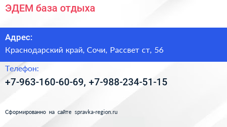 ЭДЕМ, база отдыха по адресу Краснодарский край, Сочи, Рассвет ст, 56 в дальнейшем Организация, размещена в следующих категориях: