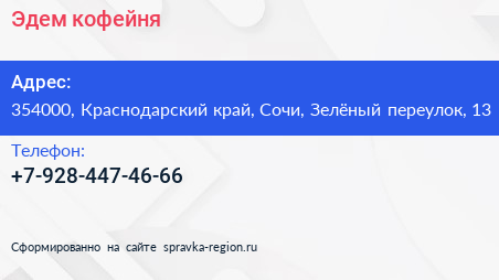 Эдем, кофейня по адресу 354000, Краснодарский край, Сочи, Зелёный переулок, 13 в дальнейшем Организация, размещена в следующих категориях:
