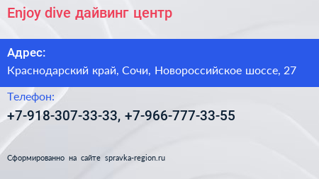 Enjoy-dive, дайвинг-центр по адресу Краснодарский край, Сочи, Новороссийское шоссе, 27 в дальнейшем Организация, размещена в следующих категориях:
