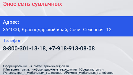 Энос, сеть сувлачных по адресу 354000, Краснодарский край, Сочи, Северная, 12 в дальнейшем Организация, размещена в следующих категориях: