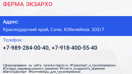 ФЕРМА ЭКЗАРХО по адресу Краснодарский край, Сочи, Юбилейная, 103/7 в дальнейшем Организация, размещена в следующих категориях: