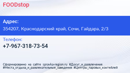 FOODstop по адресу 354207, Краснодарский край, Сочи, Гайдара, 2/3 в дальнейшем Организация, размещена в следующих категориях: