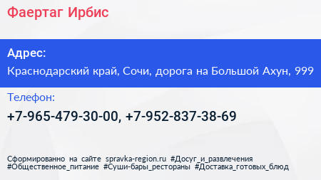 Фаертаг-Ирбис по адресу Краснодарский край, Сочи, дорога на Большой Ахун, 999 в дальнейшем Организация, размещена в следующих категориях: