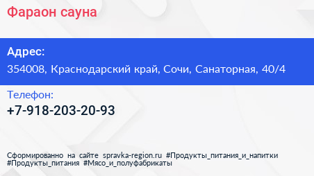 Фараон, сауна по адресу 354008, Краснодарский край, Сочи, Санаторная, 40/4 в дальнейшем Организация, размещена в следующих категориях: