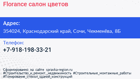 Florance, салон цветов по адресу 354024, Краснодарский край, Сочи, Чекменёва, 8Б в дальнейшем Организация, размещена в следующих категориях: