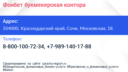 Фонбет, букмекерская контора по адресу 354000, Краснодарский край, Сочи, Московская, 18 в дальнейшем Организация, размещена в следующих категориях: