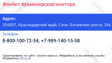 Фонбет, букмекерская контора по адресу 354207, Краснодарский край, Сочи, Батумское шоссе, 19а в дальнейшем Организация, размещена в следующих категориях: