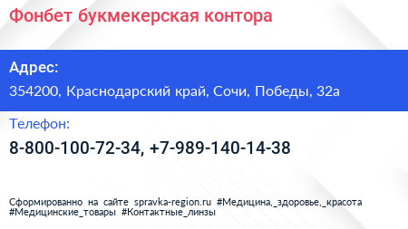 Фонбет, букмекерская контора по адресу 354200, Краснодарский край, Сочи, Победы, 32а в дальнейшем Организация, размещена в следующих категориях: