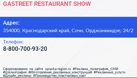 GASTREET RESTAURANT SHOW по адресу 354000, Краснодарский край, Сочи, Орджоникидзе, 24/2 в дальнейшем Организация, размещена в следующих категориях: