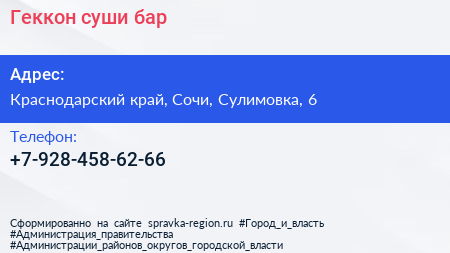 Геккон, суши-бар по адресу Краснодарский край, Сочи, Сулимовка, 6 в дальнейшем Организация, размещена в следующих категориях:
