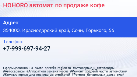 HOHORO, автомат по продаже кофе по адресу 354000, Краснодарский край, Сочи, Горького, 56 в дальнейшем Организация, размещена в следующих категориях:
