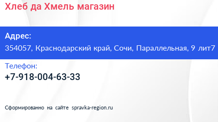 Хлеб да Хмель, магазин по адресу 354057, Краснодарский край, Сочи, Параллельная, 9 лит7 в дальнейшем Организация, размещена в следующих категориях: