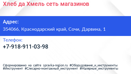 Хлеб да Хмель, сеть магазинов по адресу 354066, Краснодарский край, Сочи, Дарвина, 1 в дальнейшем Организация, размещена в следующих категориях: